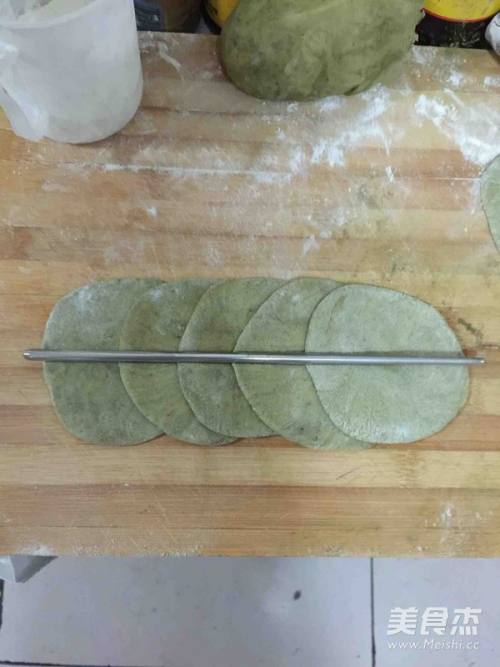 3抹茶面团取出一部分擀成五个小片,用筷子按压一下