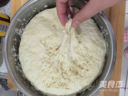 1把安琪放入牛奶里搅拌均匀和面,活好后用保鲜膜盖上放在温暖的地方发酵40分钟,会发现蜂窝眼状的面就可以了