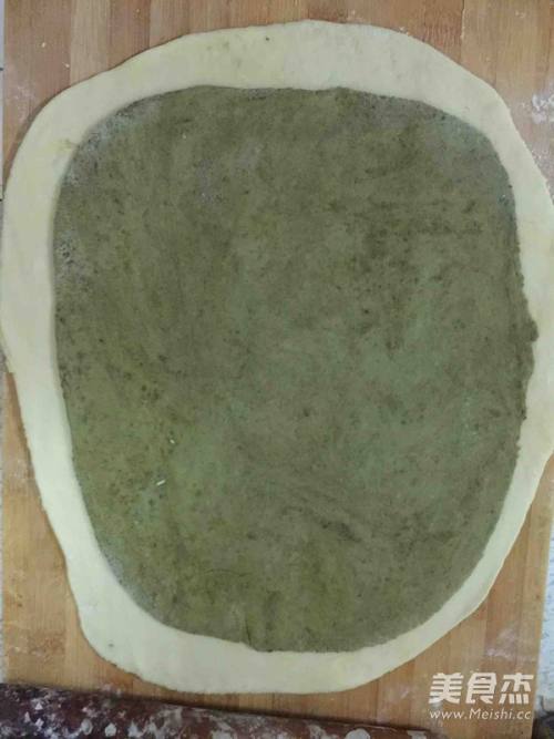 8分别把抹茶面团和白面团擀成大片,一大一小,面片上面中间可以刷一点水,这样粘性更好