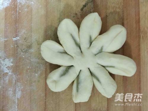 6把抹茶面片放在白面片里面团起来压扁,用刀切成8部分,中间不切断