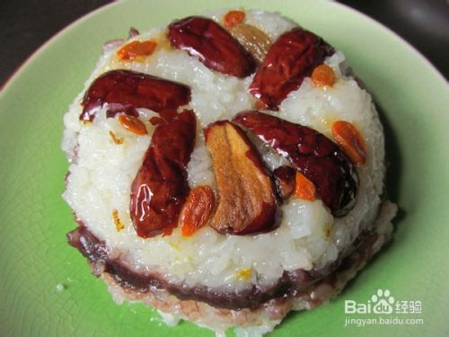 将装好的大碗糯米饭放入蒸锅,用大火蒸40分钟。稍晾凉后,先用大平盘反扣在碗上,再小心地整体翻个,将八宝饭倒扣在大平盘中即可。