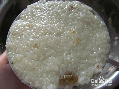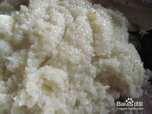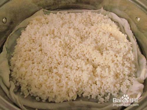 糯米在水中浸泡12个小时以上,洗净后捞出,沥干水分。在蒸锅内垫纱布,将糯米放上去,用大火蒸30分钟,制成八分熟的糯米饭。