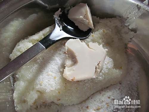 将糯米饭倒入较大的容器中,加入白砂糖、猪油搅拌均匀备用。我放的是细砂糖和冰糖桂花糖粉