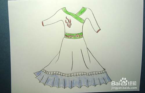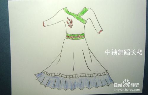 最后,用浅紫色彩铅笔给中袖舞蹈长裙的裙子边图形涂上颜色,注意颜色要搭配好看,这样中袖舞蹈长裙彩铅画就画好了,如下图所示。