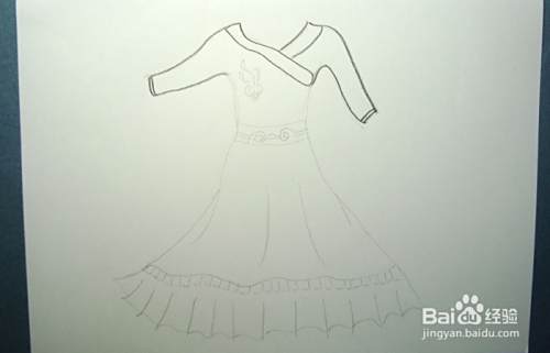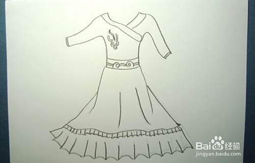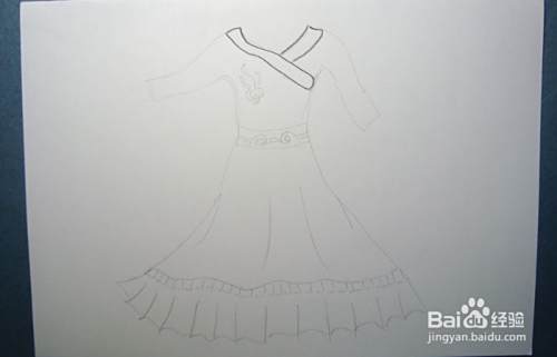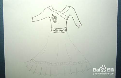 然后,用黑色的彩铅笔画出中袖舞蹈长裙的上衣图形部分,并画出腰带图形,如下图所示。