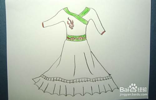 然后,用浅绿色彩铅笔给中袖舞蹈长裙的衣领图形涂上颜色,并给腰带涂上颜色,注意颜色要涂均匀,这样好看些,如下图所示。