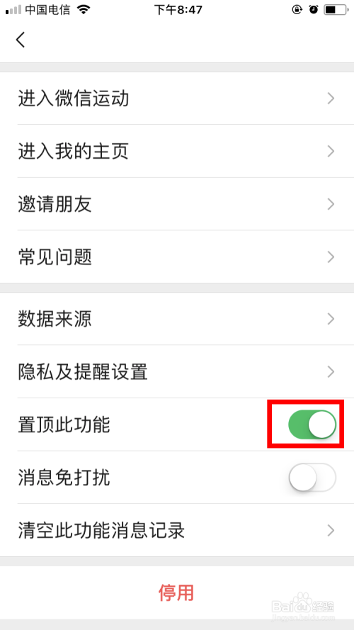 这样就进入了【微信运动】的页面,在该页面的下半部分里找到并点击【置顶此功能】后面的按钮,以便开启该功能。