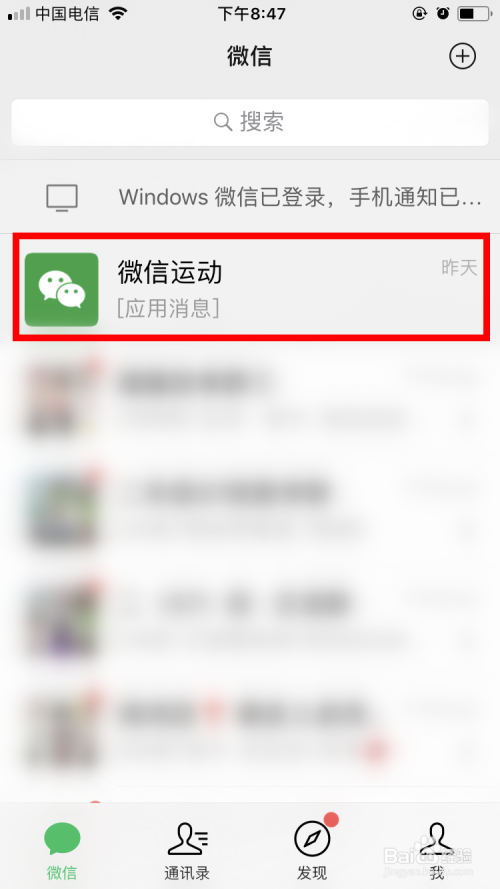 回到微信的主页面里,就可以看到微信运动在消息列表里置顶了。之后,我们就可以随时找到并查看运动情况。