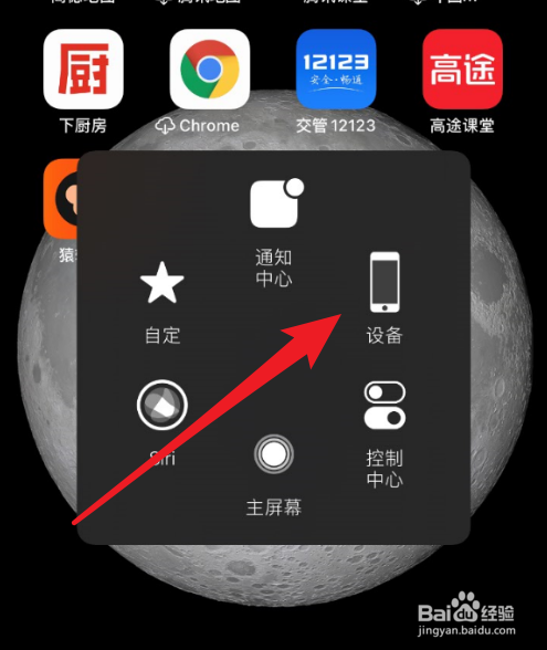 点击出现在手机界面边缘的圆形按钮,在弹出的窗口中找到【设备】,点击它