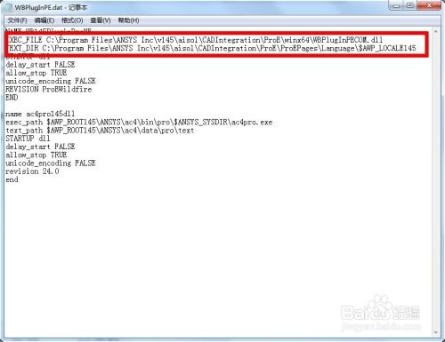 修改第二行(EXEC_FILE开头的)为“EXEC_FILE C:\Program Files\ANSYS Inc\v145\aisol\CADIntegration\ProE\winx64\WBPlugInPECOM.dll”;