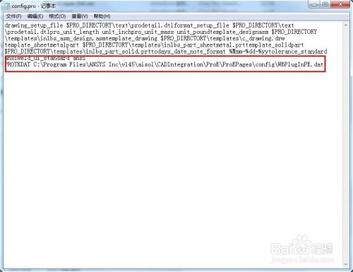 在文件内容最后添加新的一行“PROTKDAT C:\Program Files\ANSYS Inc\v145\aisol\CADIntegration\ProE\ProEPages\config\WBPlugInPE.dat”;(这个路径其实就是第一步中的文件,如果你ANSYS安装位置是自定义的,那么以你的实际情况为准)