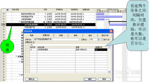 3、如果两个任务之间有间隔时,在“任务信息”-“前置任务”-“延隔时间”中设定间隔值,负值表示提前,这个值可以是天数,也可以是百分比。