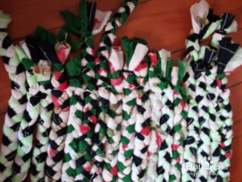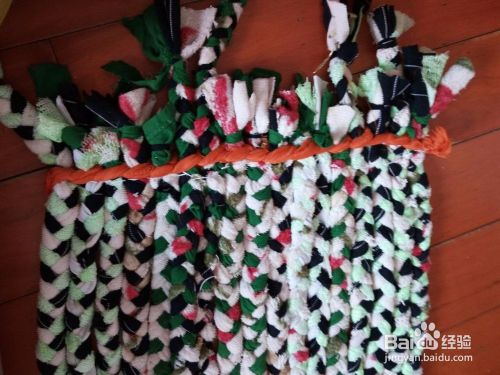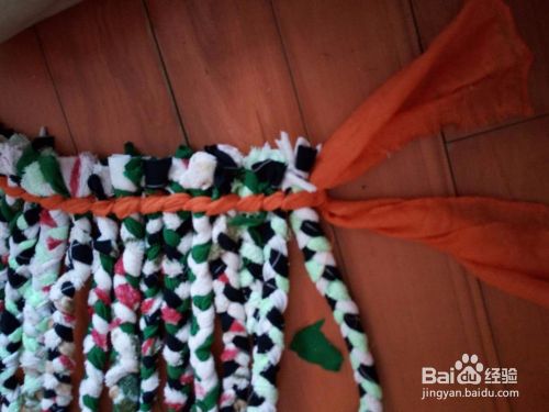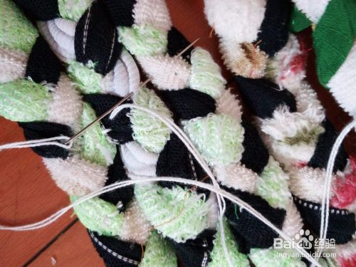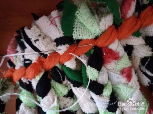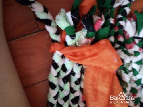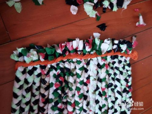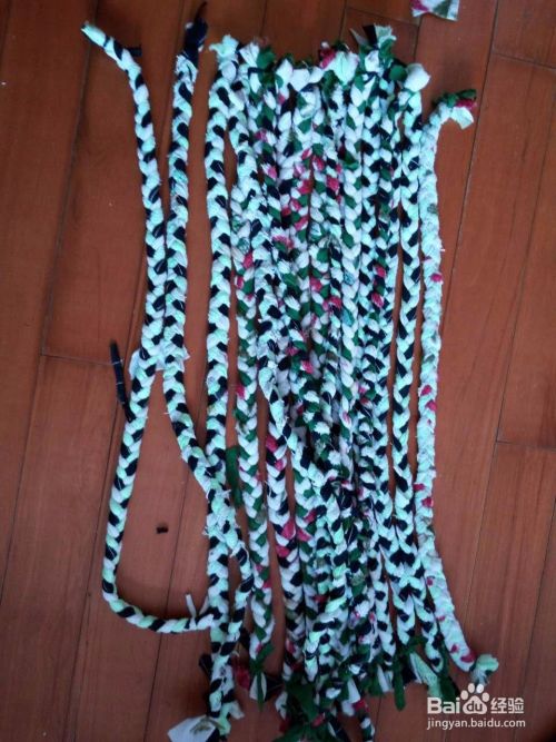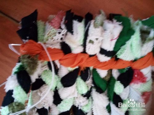 我们这里要做的是长方形的地垫,所以瓣子编够长了就再用小细布条绑住,然后剪断,再编另一根,这样不停的编一直到够编一条地垫为止
