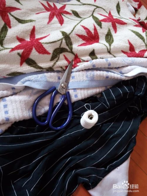 先准备材料,足够的旧衣物,根据我们要做地毯大小来准备,剪刀和针线,因为我们做地毯呢,选用的都是较厚实,的棉布材料,所以剪刀要选大号的,针也要选大号的,线也是用粗的,细线不适合