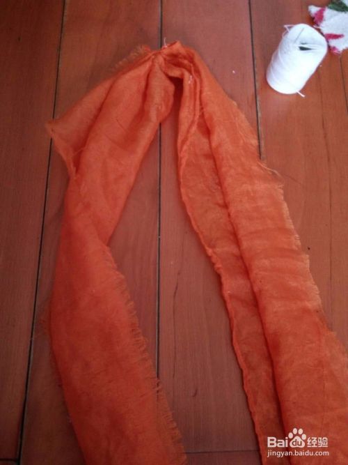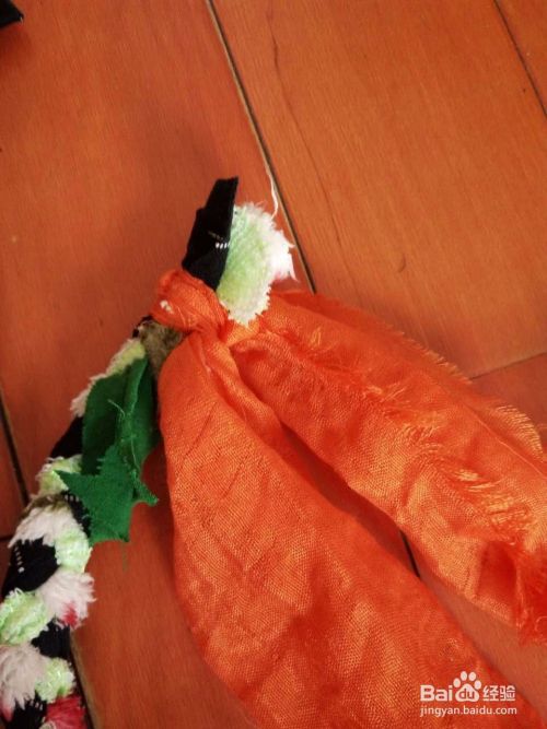 这里再取一根桔色的布条,把另一端的瓣子也全部绑住,绑完把有的瓣子,在头一打结再把多余的桔色布条剪断