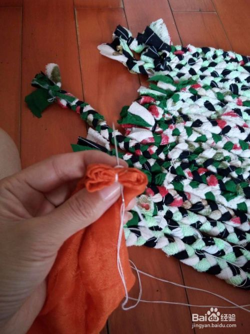 绑完后,穿好针线,首先把桔色的绑好的布条和它系住的瓣子缝一遍固定,再把布条一个接一个的缝在一起,要来回针的缝,因为如果只是穿在一起,那么两根之间会活动,间隙会拉宽,不美观,按照我们的需求,来决定缝制的密度,这样一直缝到另一端