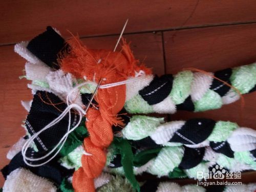 瓣子编好了,我们取两根布条这里用的是桔色的,把接口缝合,或是拿一根足够长的布条,把所有瓣子的一端一个接一个的绑上,一直到把所有的瓣子都绑完,打结,然后把长出的桔色布条剪断,