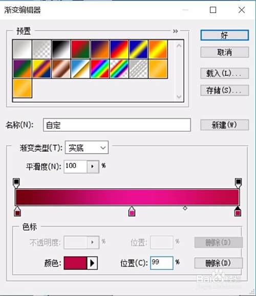 当确定了自己所需的打折促销小标签的色调之后,我们可以先设置一下这个渐变的调色板,从深紫红色到浅再到深紫红色的一个过渡。再选择钢笔工具,把这个小标签的形状勾勒出来,从而形成一个封闭的路径。