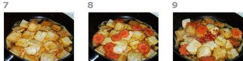 6锅中留下煎炸虾头的油,放入豆腐。