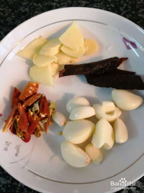 将姜、桂皮、干辣椒、大蒜洗净切好备用;