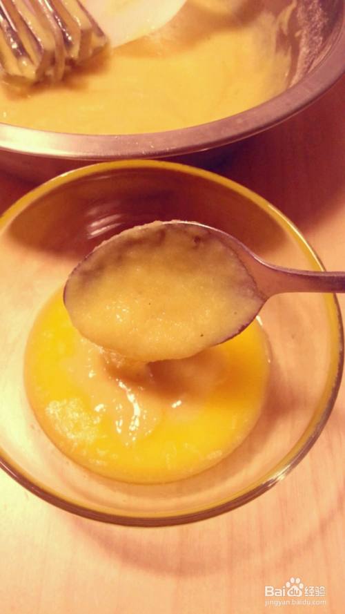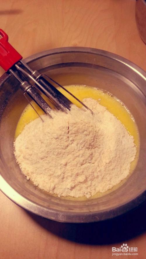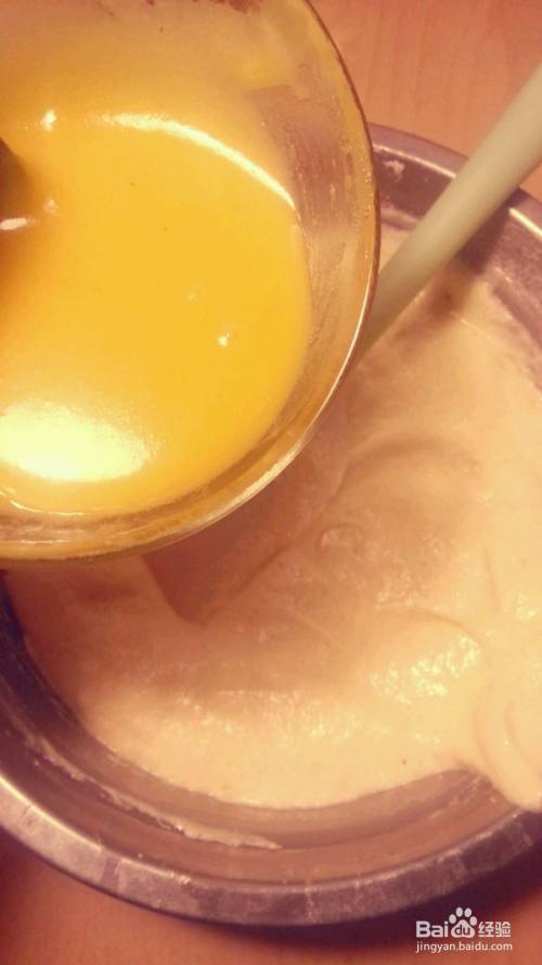 将7步骤中混合好的面糊取3勺加入黄油中,混合均匀。备用。