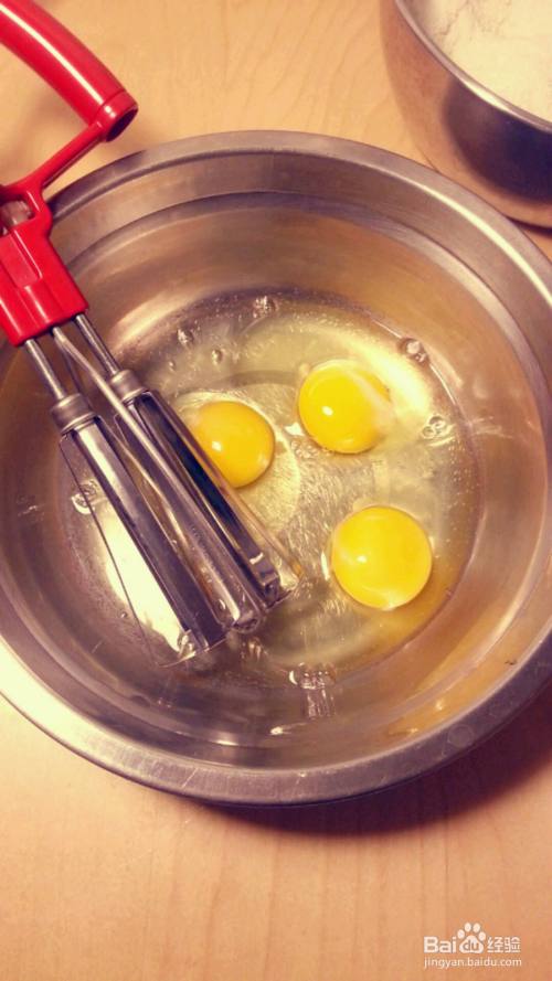 预热烤箱200度。将3个鸡蛋的蛋白分3次加入细砂糖,打至干性发泡。(具体打发步骤见我的6寸戚风蛋糕菜谱)