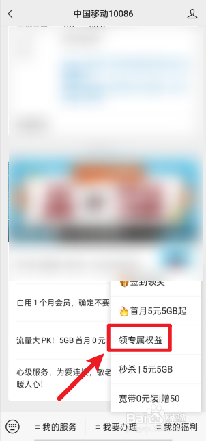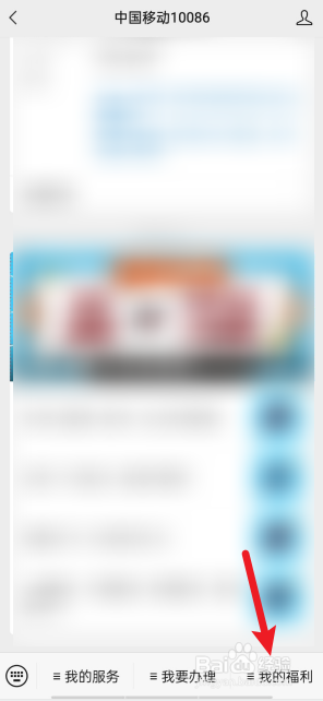 首先打开微信,找到中国移动10086公众号,点击我的福利。。