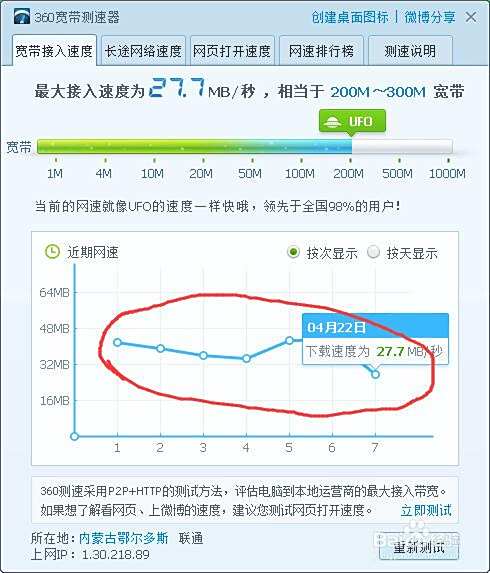 你如果每隔一段时间测一次,你还会看到当前网速怎么样,是否突然变慢了。