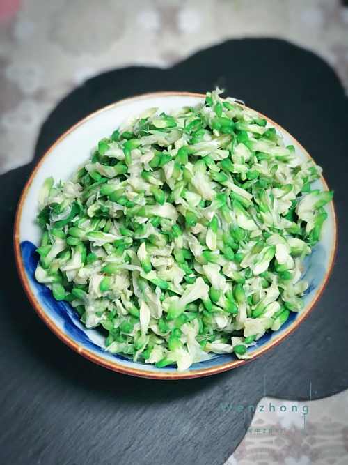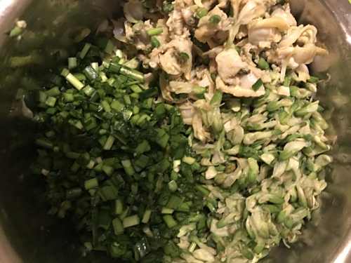 7把槐花挤干水分(越干越好)蛤蜊肉和切成细沬的韭菜一起放入干净的容器里