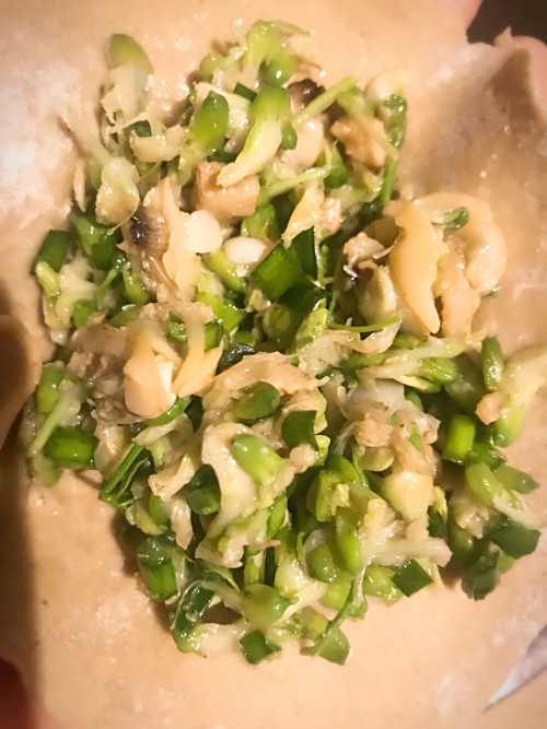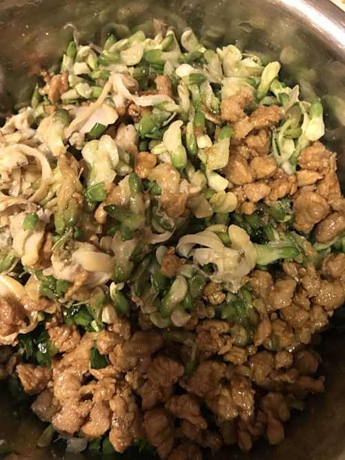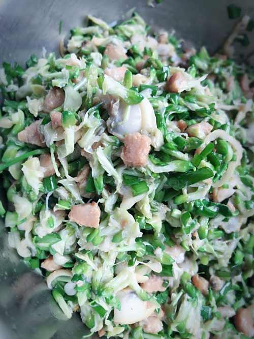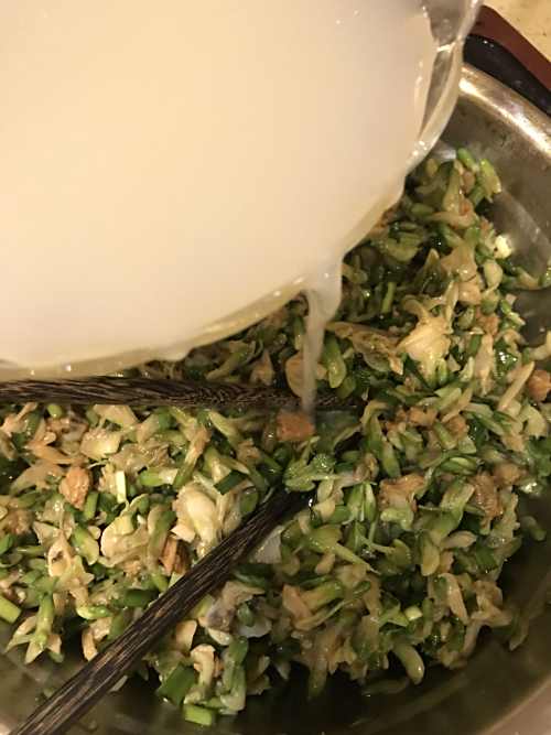 9倒入干净的蛤蜊汤,一定要少倒,不够可以再加,控制不好馅太湿不好包