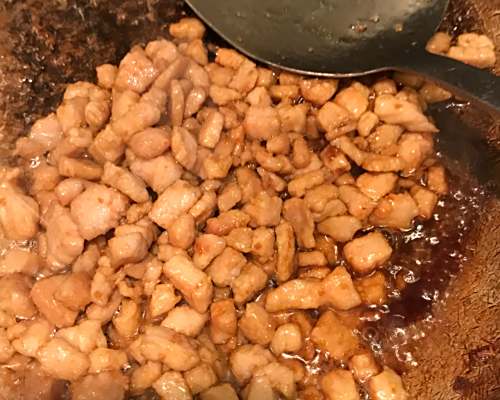 6肉切小丁,锅内加适量油,油开放肉丁炒变白加适量生抽蚝油,翻炒均匀关火放凉