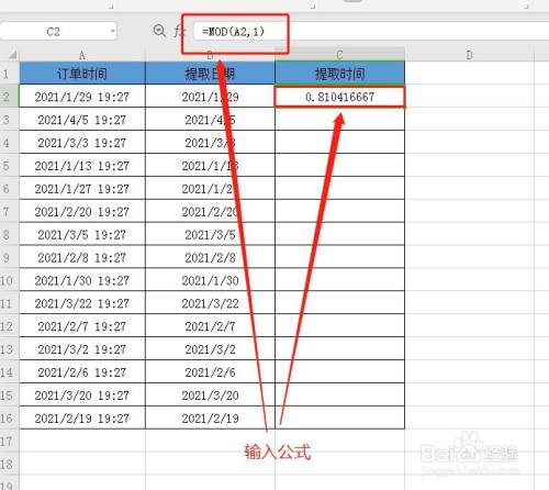 点击【C2】单元格,并在单元格内输入:=MOD(A2,1),按回车键。如下图