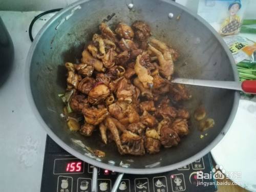 将鸡块倒入锅中大火翻炒3分钟,由于放了白糖肉会很快上色,这个过程中放盐及酱油。
