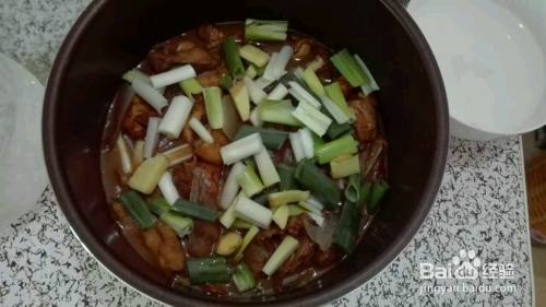 放炖鸡料包2小包,由于葱买得多,所以高压炖时又把余下的放进锅里。合上高压锅盖子,调到炖鸡肉档。大约20分钟后,换成收汁入味档即可。