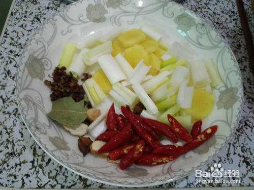 各种佐料登场。将葱、辣椒切段,姜切片,八角、花椒等调料准备好。