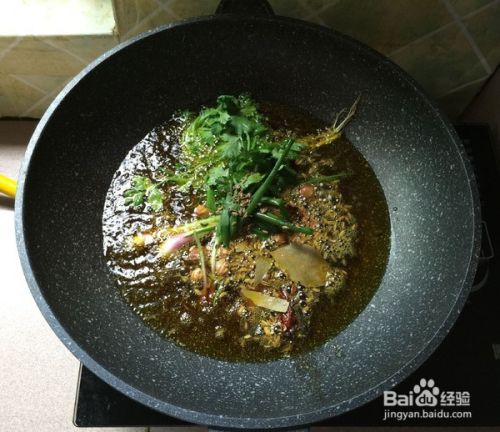 剩下的菜籽油,待温度降至30~40度的时候,沥掉香料。