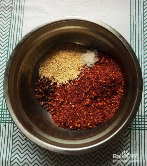 取一个不锈钢的深盆,依次加入称重好的辣椒面,白芝麻,花椒,白糖和精盐。