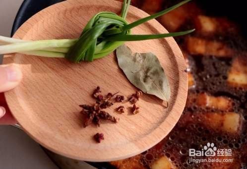 放入生抽、葱结、花椒、八角、一片香叶,盖上锅盖大火烧开,转中火烧;