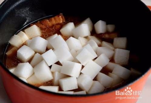 烧至五花肉7-8成熟时,倒入白萝卜,放入适量的盐,继续焖煮;