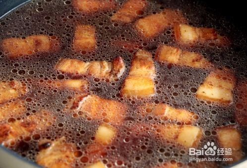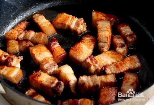 加入五花肉翻炒至上色;