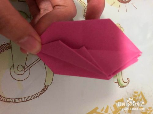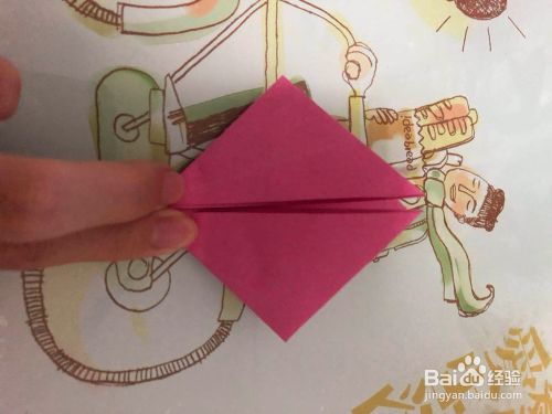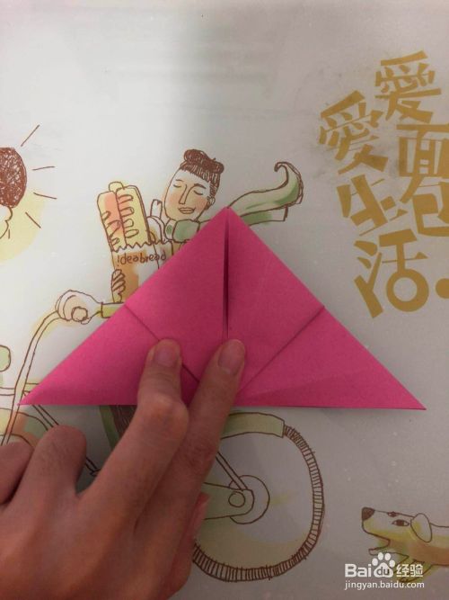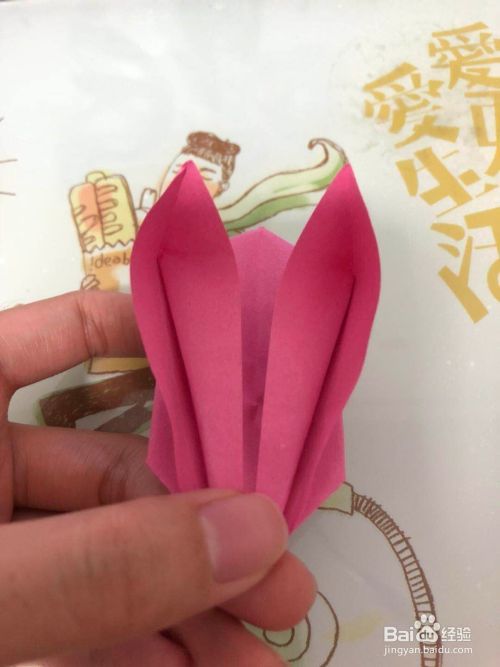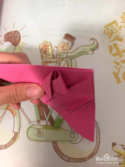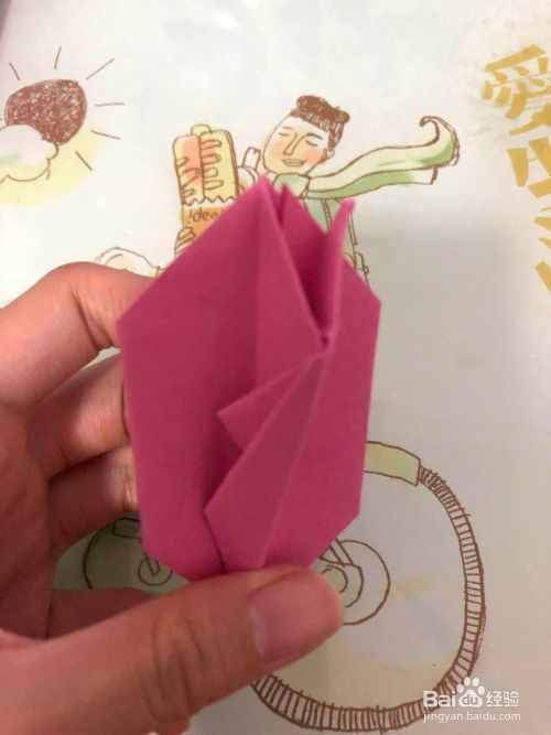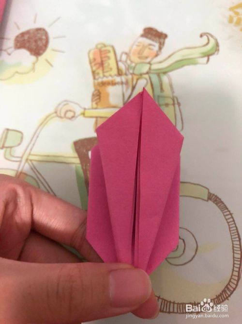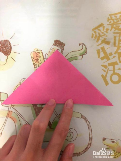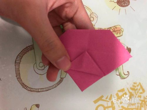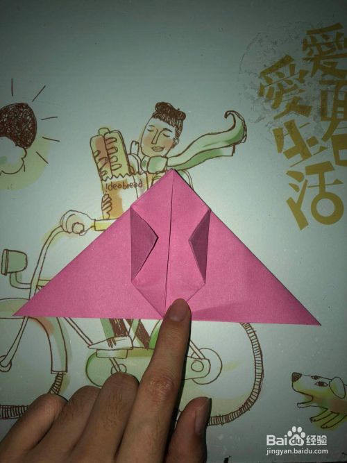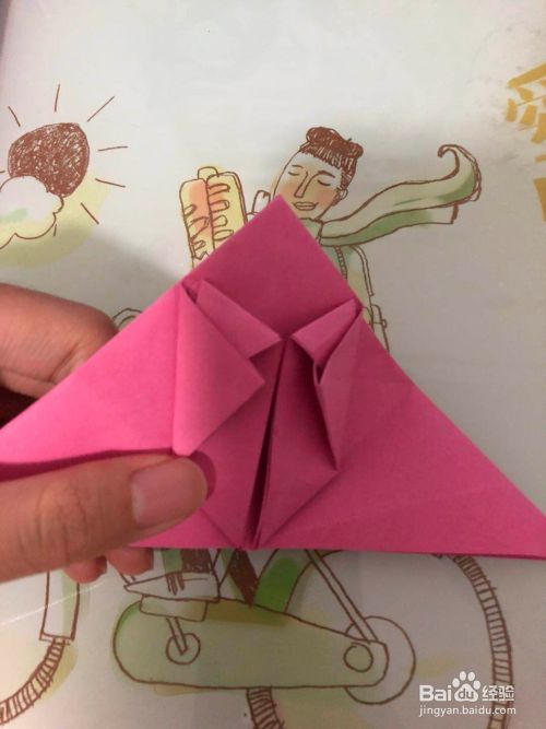 折好后翻到背面,按1中向上翻折。三角形往中间对角线折,但是折到里面,外面是看不见的,两边都是如此。