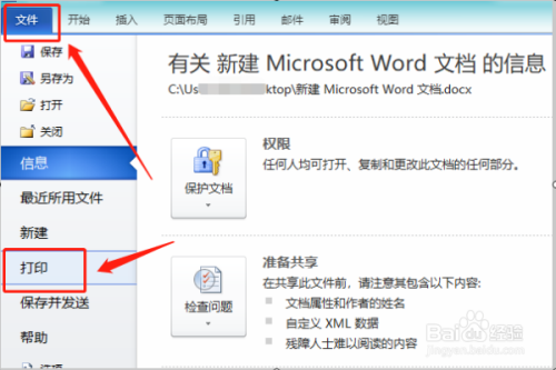 以Word2010版本为例,如下图,打开要打印的文档后,点击页面左上角的“文件”,在弹出框里点击“打印”;