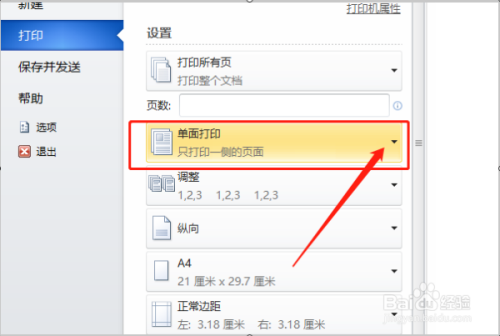 在右边的打印设置里,点击单面打印右边的倒三角图标;