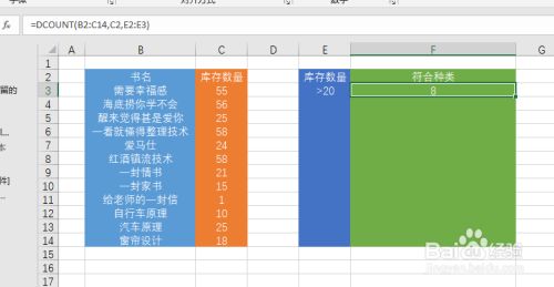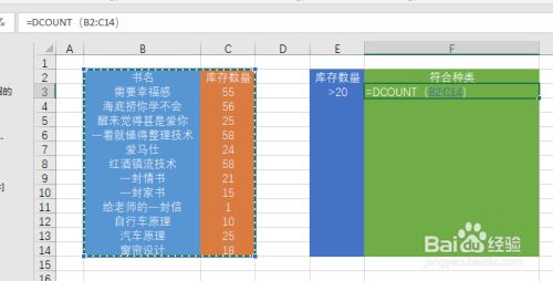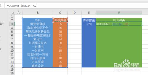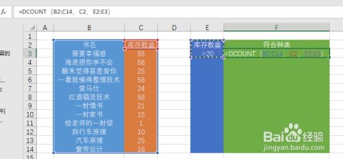 例如:我们求取图中高于20库存的商品数量有多少种,就可以使用DCOUNT函数