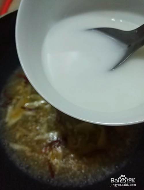 再准备一个碗,加入适量的水淀粉倒入锅里。