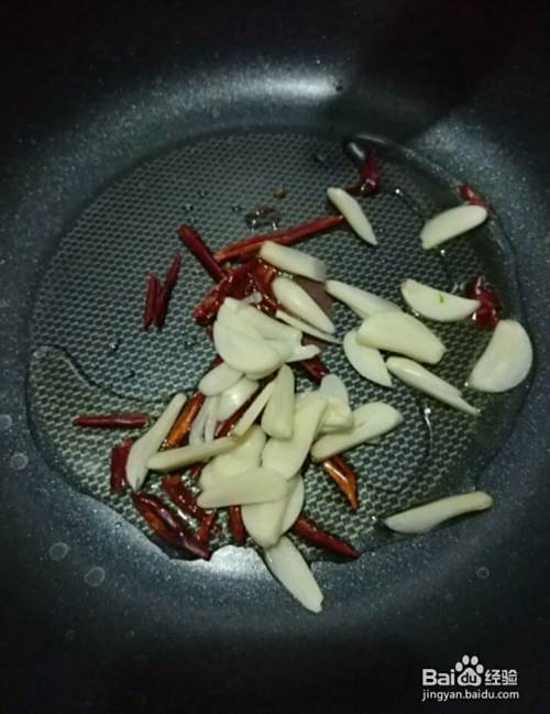 再加入适量的蒜片和红干椒丝,翻炒均匀。