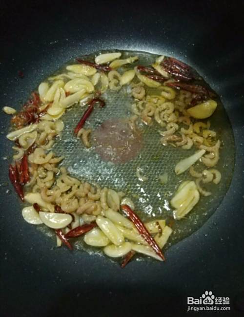 再把之前泡好的海米倒入锅里,翻炒。
