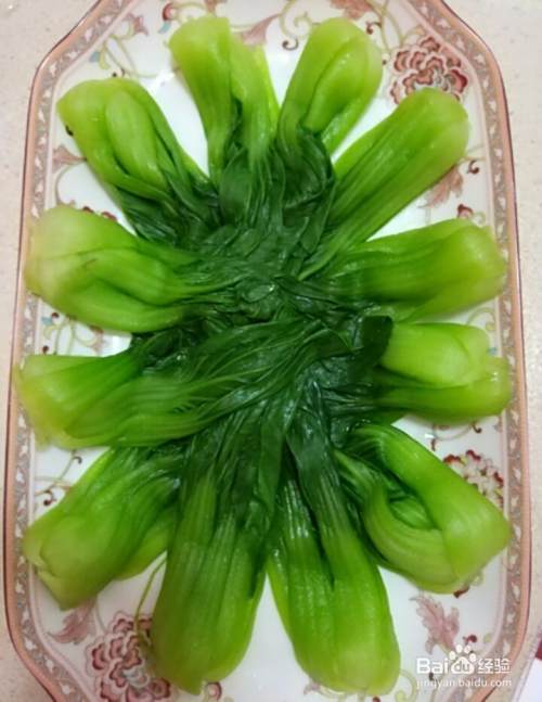 然后煮熟后,把小油菜给捞出来控干水分,整颗的小油菜摆盘。