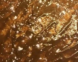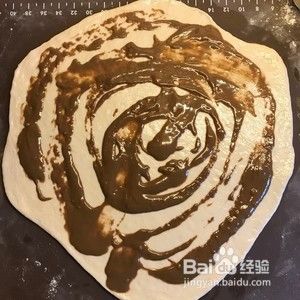 糖馅做好后就可以把面擀开了,擀成5到8毫米后的片,圆的,长方的都可以。先放一些油在面片上,薄薄一层就可以,因为麻酱里本身也有油。我用的六必居的麻酱,四勺即可。六必居麻酱稀稠正合适,不用再调了。看,像图片这样放上麻酱,此处有挥毫泼墨的意思?