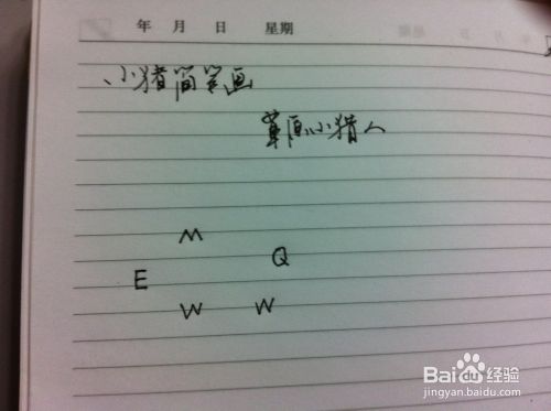 然后在E的右上方不远处可以写一个大写的英文字母"M"来代表小猪的耳朵, 现实中猪的耳朵可不是这样的, 艺术是取自生活高于生活, 呵呵.